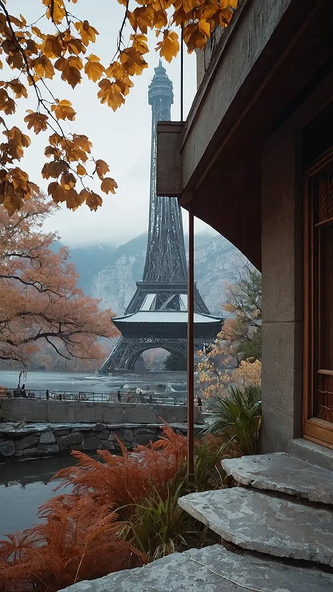 This picture is like a postcard from a fairytale! It’s got the Eiffel Tower, which is already pretty dreamy, but then they had to go and add some fall colors to the mix. You can see the leaves are all golden, like they’re shimmering in the sunlight. The reflection of the tower in the water is so clear, it’s like a mirror. And can you believe those golden leaves? They look like they’re falling from the sky!