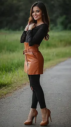 This girl is rocking a look that’s totally chic! She’s got on a black top that looks super comfy, but the star of the show is definitely that amazing brown leather skirt! It’s like a little piece of sunshine in a world of boring jeans. And those heels? Don’t even get me started! They’re the perfect finishing touch to an outfit that screams “I’m confident and ready to take on the world!”