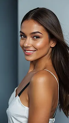 This woman is rocking a seriously sleek hairstyle! Her hair is so smooth and straight, it practically shines like silk. It’s like she just stepped out of a hair commercial, but with a more natural and effortless look. And with that bright smile, you’d think she just got the best news ever!