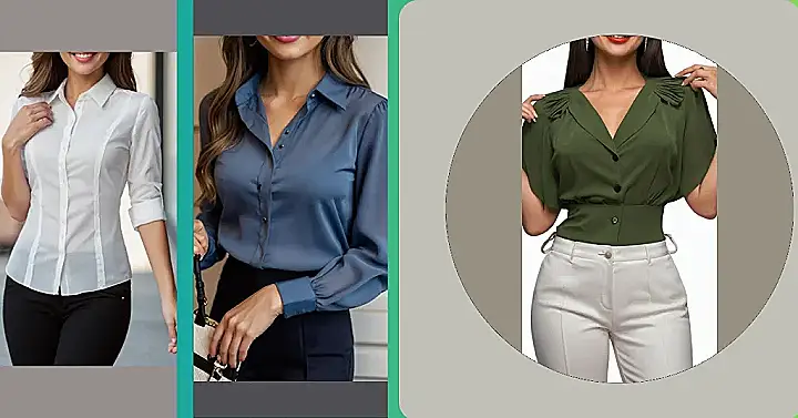 Pair it with jeans, a skirt, or even dress pants like the model (who, let’s be honest, looks like she’s ready to conquer the world, one stylish step at a time). The slightly sheer material is perfect for showing off a hint of personality, and that dark collar adds just the right pop to keep things interesting. You’ll be turning heads and probably inspiring a few style-related compliments. So go on, give this blouse the love it deserves!