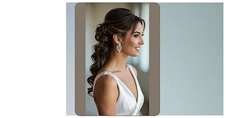 Just look at those beautiful, bouncy curls cascading down, perfectly framing her face and those seriously sparkly earrings! This shoulder-length dream style gives you all the elegance of an updo without feeling too stiff or like your head is glued in place. Plus, a half-up ‘do means your hair stays put through all the emotional moments, awkward family photos, and definitely through busting out your best moves when the DJ drops your favorite song. It’s the ultimate blend of looking fabulous and being practical, letting you focus on celebrating the happy couple (and maybe snagging an extra slice of cake).