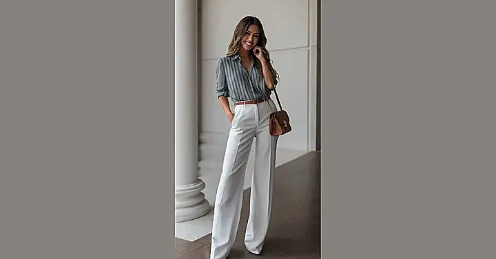 Thinking about formal work outfits? It’s like trading your favorite hoodie and comfy jeans for clothes that mean business! Like this look in the picture – those wide white pants aren’t exactly what you wear for Netflix bingeing, right? They’re more like, ‘Yep, I’m here to get things done (and maybe impress my imaginary boss).’ It’s kinda funny how putting on a crisp striped shirt and some fancy trousers instantly makes you feel like you know what’s up, even if you’re just trying to figure out how to use the office coffee machine.