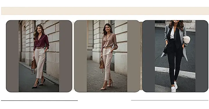 Take a look at this outfit! It’s basically the ultimate ‘chic looks outfit’ tutorial come to life. We’re talking a sleek white top that says “I woke up like this,” perfectly tailored beige pants that probably know more about adulting than I do, and a belt that cinches everything together like a fashion superhero. This is the kind of look that makes you feel like you’re about to sign a multi-million dollar deal or at least get an A+ on that history test without studying. It’s so put-together, it almost looks like it has its own LinkedIn profile.