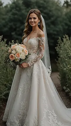 Look at this wedding gown! It’s like something straight out of a fairytale, with all that gorgeous lace detailing and those elegant long sleeves. The way the skirt flows, you just know it’s ready for a grand entrance, or at least a super dramatic twirl on the dance floor. This dress probably requires its own personal assistant just to manage the train, and let’s be real, you could definitely hide a small emergency stash of chocolate bars in all those beautiful layers.