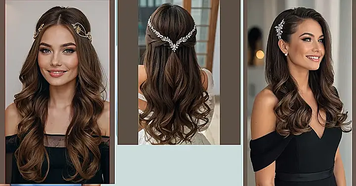 Let’s talk about that hair piece, though! It’s like a little crown for your hair, reminding you that you’re the queen of the evening. It adds just the right amount of bling, and it perfectly matches those dazzling earrings. With this hairstyle, you’ll be feeling like a princess all night long, ready to dance the night away and make some magical memories.