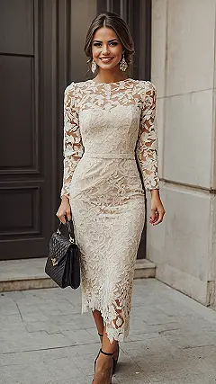 Wearing an outfit this gorgeous is like getting an instant confidence boost, no energy drink required. It’s perfect for those moments when you want to look super sharp but still feel comfortable enough to bust a move (carefully, in those heels!). Plus, it’s proof that ‘classy’ doesn’t mean boring; this dress has enough cool lace details to keep everyone guessing if it’s vintage or fresh off the runway. Just be warned, you might find yourself practicing your fancy walk in the mirror, and don’t be surprised if people start asking for fashion advice – you’ll be a style icon overnight!