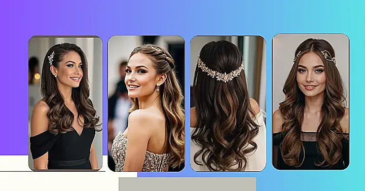 Let’s talk about that hair piece, though! It’s like a little crown for your hair, reminding you that you’re the queen of the evening. It adds just the right amount of bling, and it perfectly matches those dazzling earrings. With this hairstyle, you’ll be feeling like a princess all night long, ready to dance the night away and make some magical memories.