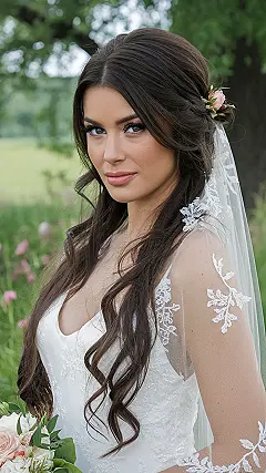 Forget stiff, uptight hairstyles! This look is all about effortless beauty. Those subtle waves and the way the veil softly drapes? It’s a major mood. Plus, who needs a tiara when you have a beautiful flower crown nestled in your hair? This hairstyle is versatile enough to fit any wedding style, from a boho beach bash to a fancy ballroom. It’s a definite “yes” for anyone who wants a wedding hairstyle that looks stunning but still feels comfy and casual.