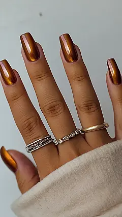These nails are like a warm hug from the sun! They’re a simple, classic golden brown, but with a shimmer that makes them look like they’re catching the last rays of the day. You could totally wear these nails with anything, from a cozy sweater to your fave jeans and tee. They’re like the perfect accessory for any outfit, and they’re not even trying! They’re just chill and stylish, like a good friend who always knows what to say.