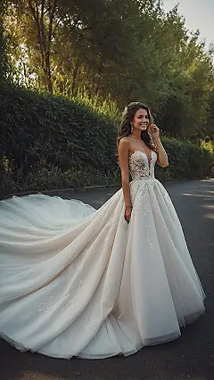 Look at this amazing wedding gown making its grand appearance in what seems like a magical forest! With that stunning lace, the elegant full skirt, and the way the sunlight hits it just right, she genuinely looks like she stepped out of a fairytale, perhaps on her way to tell woodland creatures about her big day. This dress probably took a small army to get into, not to mention making sure no mischievous squirrels tried to borrow a bit of the train for their nest-building efforts. It’s the kind of show-stopping outfit that makes you want to twirl, even if you’re secretly worried about tripping over your own fabulous feet (or a rogue tree root!) in all that gorgeous fabric.