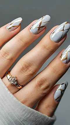 These nails are like the perfect autumn day‚Äîcrisp and cool with a touch of warmth! The light grey polish is a total vibe, like the sky after a cool fall rain. And the gold accents? They’re like the leaves changing color, giving you a little sparkle without being too loud. It’s like the best kind of autumn outfit‚Äîclassy, cozy, and just a little bit glam!