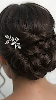 That hairstyle is seriously stunning! It’s like a fancy, grown-up version of a messy bun, but way more elegant. Imagine rocking this look at your own wedding—you’d be the chicest bride ever! The sparkly hairpiece is the perfect touch, adding a little “wow” factor without being too over-the-top. It’s all about that perfect balance between looking amazing and feeling comfortable. You could totally dance the night away without worrying about your hair falling apart!