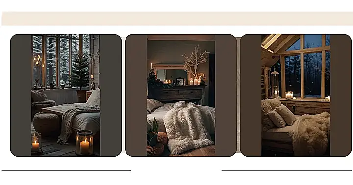 This picture makes me want to curl up in a big, comfy bed with a good book and a mug of hot cocoa! It’s like a winter wonderland in a bedroom, with fluffy blankets and pillows, warm candlelight, and a window that shows a snowy scene outside.