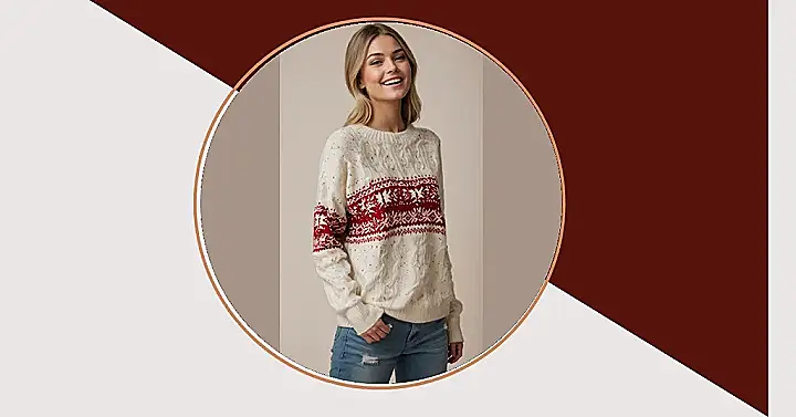 Forget about those “ugly Christmas sweater” parties, because this festive knit is here to prove that holiday fashion can be seriously chic! Our friend in the picture is rocking a cozy red and white sweater, complete with an adorable reindeer parade, that just screams holiday cheer without trying too hard. It’s the kind of top you’d wear to sip hot cocoa by the fireplace or maybe even outsmart Santa’s elves in a friendly snowball fight. She looks perfectly snug and stylish, ready to spread some serious holiday sparkle (and probably win all the family photos).