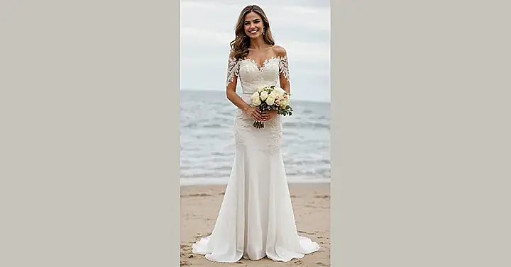 This dress totally nails the “modern minimalist” assignment, proving that you can be sleek and stunning without looking like a human disco ball. It’s got that fitted mermaid shape that says “I’m here to slay, not to float away in a cloud of tulle,” and the off-the-shoulder neckline is just chef’s kiss. It’s the kind of gown that lets you move with confidence, probably even pull off a surprise dance move or two without tripping over a ballroom-sized skirt. Plus, it’s proof that sometimes, less volume means more wow factor!