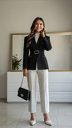 This outfit screams “I inherited a yacht, not just a yacht club membership!” The woman in the picture is rocking a seriously sophisticated look. It’s all about classic pieces—think sleek black blazer, crisp white pants, and heels that could probably walk themselves to a charity gala. It’s the kind of outfit that makes you feel like you could casually discuss the stock market while sipping champagne… even if you’re actually just planning your next Netflix binge. It’s the perfect example of how to dress like you’re already living your best, luxurious life!
