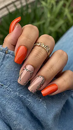 And then, for the plot twist, we’ve got the nude nails totally serving up some intricate drama! Those delicate black lines, sprinkled with a galaxy of tiny sparkly gems, make them look like miniature works of art – like a secret map to buried treasure, but on your fingertips. It’s the kind of detail that screams “I put thought into this,” perfectly balanced with the solid orange nails. Plus, that gorgeous gold ring just ties the whole look together, proving you don’t need a formal event to rock seriously stunning coffin nail art!