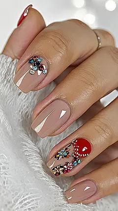 Forget boring old nail polish; these modern nails are basically throwing a full-blown party on your fingertips! With a super chic nude base that lets the shine really pop, these aren’t just painted nails – they’re tiny canvases featuring some serious 3D art. It’s like each nail decided it wanted to be a fancy brooch or a miniature piece of jewelry, complete with all those colourful, sparkling gems. You might even find yourself constantly staring at your own hands, trying to figure out if you’re holding a secret treasure map.