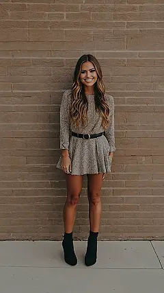 **Paragraph 1:** OMG, this outfit is seriously adorable! It’s giving major “cozy chic” vibes, perfect for those crisp autumn days. That grey sweater dress is like a hug you can wear – so comfy! And the black boots? They’re the perfect touch to add a little edge. I bet she’s heading to pumpkin spice everything-land and is looking totally ready for a fall photoshoot. You know, the kind with perfectly-raked leaves and a pumpkin-spice latte in hand.