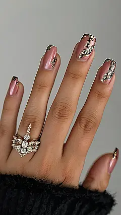 These nails are totally rocking a fancy, sparkly look perfect for ringing in the new year! Imagine showing these off at a New Year’s Eve party – seriously dazzling! The dusty rose color is so elegant, and those gold and black accents are like something a princess would wear. It’s like they’re miniature works of art, and if you add a ring like that one, you’re officially the queen of cool.