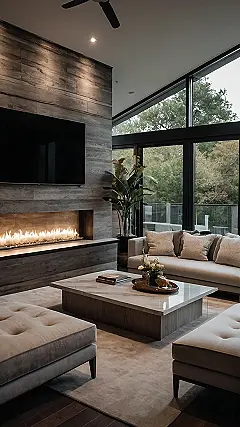 The whole room has a super fancy feel to it with all the dark wood and the big windows that let in all that natural light. It’s kind of like a mix of rustic and modern, which is probably why it’s so popular these days. It’s basically the perfect space to relax, watch some TV, and maybe even have a little movie night with your friends. You can practically feel the luxury just by looking at it!