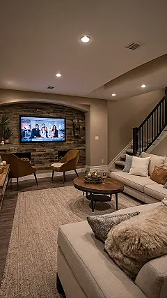 Stepping into this basement feels like getting a giant, warm hug from a super comfy blanket. With those soft lights making everything glow and the chairs looking like they’re just begging you to sink in, it’s pretty much the perfect spot for a serious movie marathon or an epic gaming session. Forget about the upstairs world and all those chores; this cozy basement is your official escape pod, ready for peak relaxation and maybe just a little bit of snack-induced coma. It’s so inviting, you might even forget there’s sunlight outside!