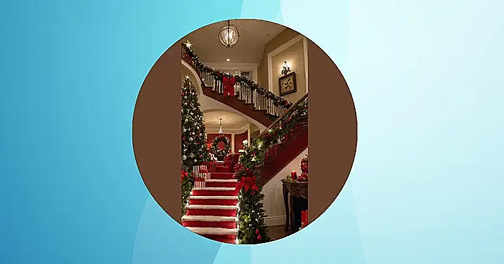 After you’ve recovered from the grand staircase, the Christmas living room beyond is ready to welcome you into a cozy, festive hug. With those comfy red armchairs and a giant, glowing wreath hanging over what looks like the fireplace, it’s clearly built for serious holiday relaxation. All those perfectly wrapped presents stacked around the magnificent Christmas tree and spilling onto the steps suggest someone definitely made Santa’s nice list, or perhaps they just really love wrapping paper. This setup practically begs for a hot cocoa marathon, a board game battle, or maybe just a good old-fashioned nap after a giant Christmas dinner. Just be careful not to mistake any of those beautifully decorated pinecones for a snack!