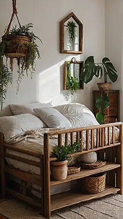 Think of waking up surrounded by all this greenery – it’s way better than just staring at a boring blank wall. The rustic wooden shelf is like a tiny forest for your stuff. Plus, those rock-looking pillows are pretty cool, like sleeping on a comfy pile of geological formations. Who knew you could bring the great outdoors inside and still have Wi-Fi?
