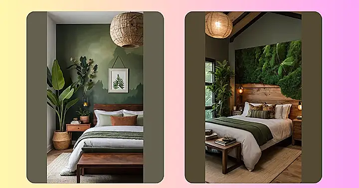Imagine waking up here every day – it’s like your own personal spa retreat, but without the expensive cucumber water. The woodsy furniture and earthy tones bring the outside in, which is way cooler than having actual bugs inside. Plus, if you ever forget what plants look like (because let’s be honest, sometimes we do), you’ve got a whole gallery of green right on the wall. Talk about a room that’s naturally awesome!