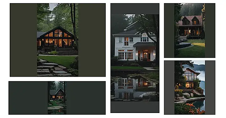 This house looks like it’s straight out of a fairytale! Imagine curling up by the fireplace with a good book on a rainy night, while the warm glow of the lights reflects in the pond outside. It’s the kind of house where you can just relax and forget about the world, you know? The big windows let in lots of light, making it feel warm and inviting. I bet it smells like freshly baked cookies and good times!