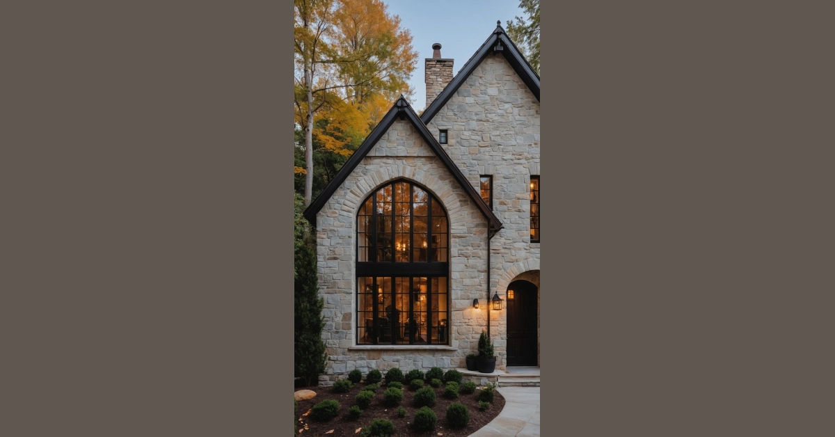 Take a look at this house that totally brings the old-school cool of a Tudor home into today’s world. Its rugged stone walls and those dramatically steep black roofs make it look like a friendly fortress ready for any adventure (or just a really good family game night). You can almost imagine knights and princesses living here, except they’d probably have Wi-Fi now and much comfier couches. The classic arched windows and grand double doors give it that awesome, historic vibe, proving some styles are just too cool to ever go out of fashion.