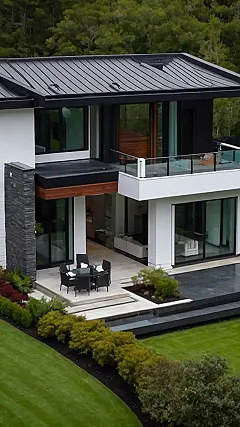 This house looks like it came straight out of a movie, right? I mean, who wouldn’t want to chill on that balcony, sipping lemonade and judging the neighbors? The stone and the wood give it this cool, modern vibe, like a superhero lives here but also enjoys the occasional picnic. It’s not just a house; it’s a contemporary residence built for maximum relaxation and probably epic parties.