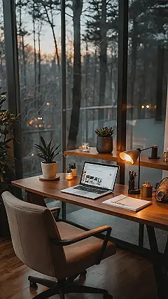 Forget the chaos of your usual study spots; this cozy private office design is practically a zen garden for your brain! With that epic window view looking out onto a peaceful forest, it’s like Mother Nature decided to be your personal bodyguard, keeping all distractions (and maybe even your little brother) far, far away. The warm glow from the lamp and those chill plants make the whole place feel so inviting, you might actually trick yourself into thinking homework is fun. It’s like your desk is giving you a warm, comforting hug while you ‘work’.
