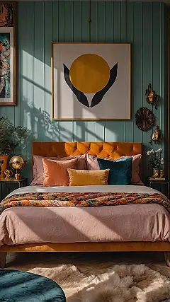 Forget trying to count sheep in a room this awesome; you’d be too busy taking in all the cool details! The bed itself is pure luxury with that plush teal velvet headboard, practically begging you to sink in and chill. And check out those throw pillows – bright yellow, deep blue, hot pink – they’re like a rainbow had a stylish pillow fight on the bed. The warm, glowing light from the fancy chandelier and those cool wall lamps gives everything a super cozy, almost secret garden feel. It’s the kind of place where you could binge-watch your favorite show all night or just relax and feel like you’ve stepped into an epic, comfy adventure.