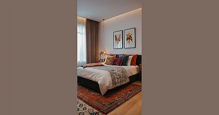 But wait, there’s more than just the bed trying to hypnotize you into eternal rest! Take a peek at that awesome artwork above the headboard; it’s abstract and cool, adding a pop of ‘what exactly *is* that?’ mystery that perfectly suits the ‘moody’ vibe. And down below, the rug is basically a party on the floor, full of wild patterns and colors that prove this room isn’t shy about showing off. From the fancy wall panels to the subtle details on the nightstand (are those dried flowers? Very dramatic!), this space nails the ‘maximalist’ part by having something interesting everywhere you look, making it the ultimate hangout spot for when you want to feel a little bit fancy and a lot comfortable.