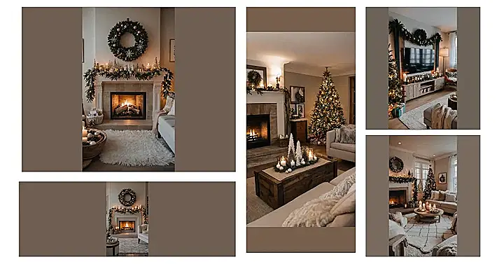 Stepping into this Christmas living room is like getting a warm hug from a giant, fluffy blanket, but with extra sparkles! That crackling fireplace isn’t just for show; it’s practically begging you to grab a mug of hot cocoa and sink into those super soft white couches. With all the glowing candles and that gorgeous wreath above the mantel, it’s clear this room is ready to host all the holiday cheer, and probably a few epic nap sessions too.