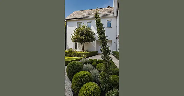 Check out this front garden landscape! It’s like the plants all got together and decided to have a super organized, incredibly stylish party. You’ve got these perfectly round bushes that look like someone gave them the ultimate, most precise haircut – not a single leaf out of place! It’s so neat, you almost expect them to salute you as you walk by. With that bright white house in the background, this whole scene really pops, showing off its serious green vibes and making every day feel a bit more fancy.