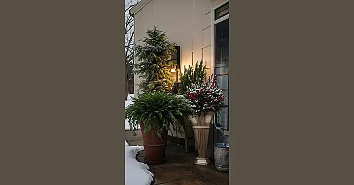 These plants are probably hardy varieties that can handle the cold. Maybe they’re even evergreens, which means they keep their green leaves all year round. They might be spruce trees or something similar! If you’re thinking about adding some winter planters to your porch, these are a great inspiration. Just make sure you choose plants that are right for your climate, and you’ll be good to go!