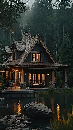 This house looks like it’s straight out of a fairytale! Imagine curling up by the fireplace with a good book on a rainy night, while the warm glow of the lights reflects in the pond outside. It’s the kind of house where you can just relax and forget about the world, you know? The big windows let in lots of light, making it feel warm and inviting. I bet it smells like freshly baked cookies and good times!