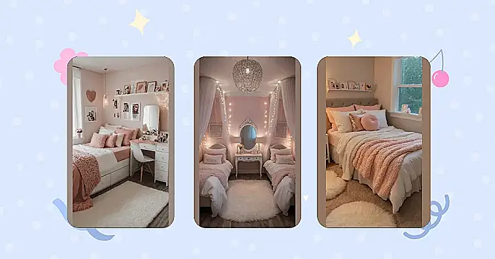 And when you’re done dazzling, this space totally transforms into the ultimate hangout spot! Reflected in the mirror, you can spot twinkly fairy lights that make everything feel super magical and cozy – perfect for late-night chats with your besties or just unwinding with your favorite playlist. With fluffy pink pillows and a vibe that screams “comfort meets chic,” it’s the kind of room where you can be yourself, dream big, and maybe even film an epic TikTok. Who needs a fancy getaway when your own room looks this good and feels like a warm hug?