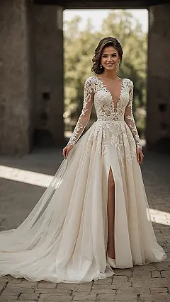 Looking at this wedding dress, you can almost hear the trumpets playing and picture yourself waving from a royal balcony. It’s got all the regal vibes, from the elegant long lace sleeves that make you feel instantly fancy, to the beautiful flowing skirt adorned with delicate patterns. This gown practically screams “future monarch” ready for her big day, making everyone wonder if a crown is hidden somewhere in those gorgeous locks! It’s definitely not your average outfit for a trip to the grocery store, that’s for sure.
