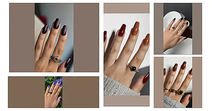 These nails are like a cozy autumn day – warm, inviting, and just a little bit mysterious. With the deep burgundy and rich brown hues, these nails are perfect for rocking the fall fashion scene. They’re like a delicious pumpkin spice latte – sweet, spiced, and sure to get you noticed. Plus, that black ring is like the perfect cherry on top! It’s edgy, cool, and makes the whole look even more awesome.