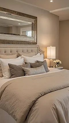 Walking into this bedroom is like getting a hug from a cloud – a very stylish, neutral-colored cloud! Seriously, look at all those pillows, lined up like they’re ready for a pillow fight or just super serious napping. That massive, comfy-looking duvet in beige practically invites you to dive in and forget about homework for a day (or maybe a week). It’s got that totally zen, calm vibe, which is perfect for unwinding. You’ve got the plush headboard and even a fresh vase of white roses already setting a pretty sweet mood. It’s basically a five-star hotel room, but without the awkward bellhop asking if you need help with your imaginary rose petal suitcase.