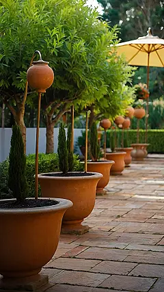 Seriously, who needs therapy when you have rows of perfectly aligned terracotta pots? It’s like the garden version of counting sheep, only way more stylish. Plus, those ball-on-a-stick decorations? Chef’s kiss! I bet they light up at night and make the whole place look like a magical Italian fairy land where the only drama is whether to have gelato or tiramisu.