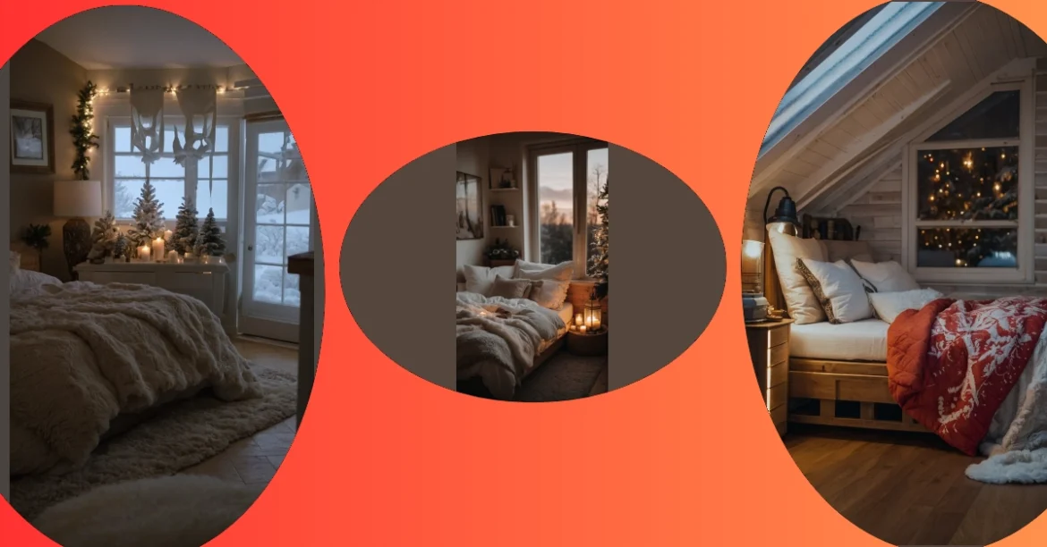This picture makes me want to curl up in a big, comfy bed with a good book and a mug of hot cocoa! It’s like a winter wonderland in a bedroom, with fluffy blankets and pillows, warm candlelight, and a window that shows a snowy scene outside.
