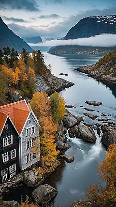 And then there are those two houses, looking all cozy with their bright orange roofs, practically living on the edge next to a waterfall that’s doing its best impression of a speedy river. You’ve got to wonder what it’s like to wake up there, maybe try to catch a fish from your living room window! The trees are just showing off their autumn wardrobes, bursting with yellows and oranges, making everything even more vibrant. This truly screams ‘Norway landscape photography goals’ – imagine trying to mow the lawn on that rocky terrain though! Definitely a unique spot, blending nature’s drama with a touch of charming, cliffside living.