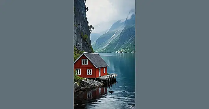 Whoa, check out this place! It’s like Mother Nature decided to show off in Norway, creating a scene so epic it could be a movie set for an adventure flick. Those gigantic mountains practically scrape the sky, looking super green and rugged, with sparkling waterfalls just casually tumbling down their sides. And then, right there by the unbelievably blue water, are these charming little red houses, all lined up like they’re waiting for a postcard photo. It’s almost like they’re saying, “Hey, we might be small, but we live next to giants and we look amazing!”