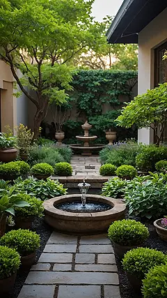 Stepping into this garden feels less like just walking outside and more like entering a hidden world where everything is perfectly neat and the water is always doing a little bubbly dance. Check out those fountains – they’re like the garden’s VIP section, always gurgling away. And look at those plants! They’re so tidy, especially the round ones, which totally make you want to give them a little pat. It’s like they hired tiny garden barbers to keep their edges sharp and round.
