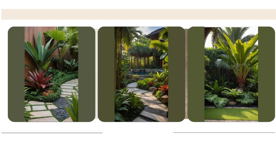These plants are the reason this place looks so cool. They’re not your average dandelions or boring bushes; they’re the superstars of the plant kingdom, making everything feel vibrant and alive. Imagine trying to hide in leaves bigger than your backpack! These tropical garden plants create a whole vibe that screams ‘vacation,’ leading you down that cool stepping stone path toward what looks suspiciously like a pool. They’re basically saying, “Forget your problems, come hang out with us and feel the chill.”