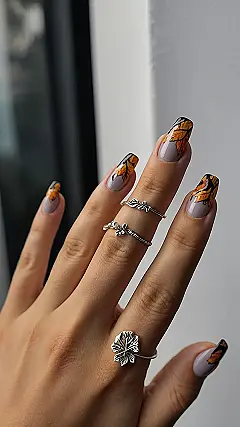 This image shows some seriously cool autumn leaf nail art! It’s like a little piece of fall on your fingertips. The leaves are painted in those classic orange and yellow shades you see on trees, and the black outline makes them pop. It’s a super cute way to show off your love for the season.